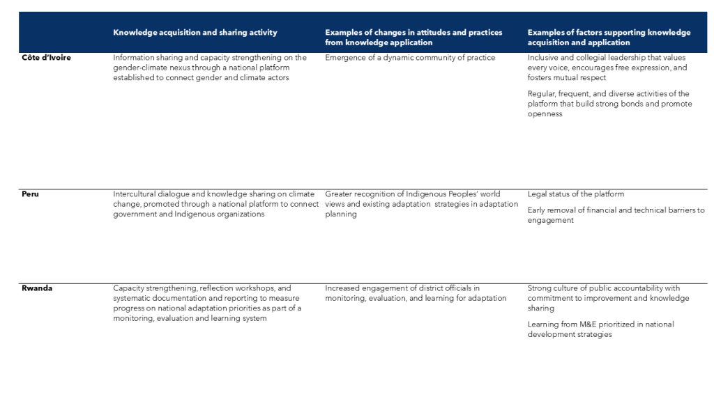 The examples show that the changes resulting from activities bringing diverse actors together to acquire and share new knowledge on adaptation are far from trivial. When key considerations such as gender equality, Indigenous worldviews, and M&E are integrated into adaptation planning, their visibility increases, making them more likely to be recognized, funded, and addressed in subsequent implementation phases. These changes can significantly boost the effectiveness of climate adaptation efforts, reminding us why investing in learning within NAP processes is so valuable.