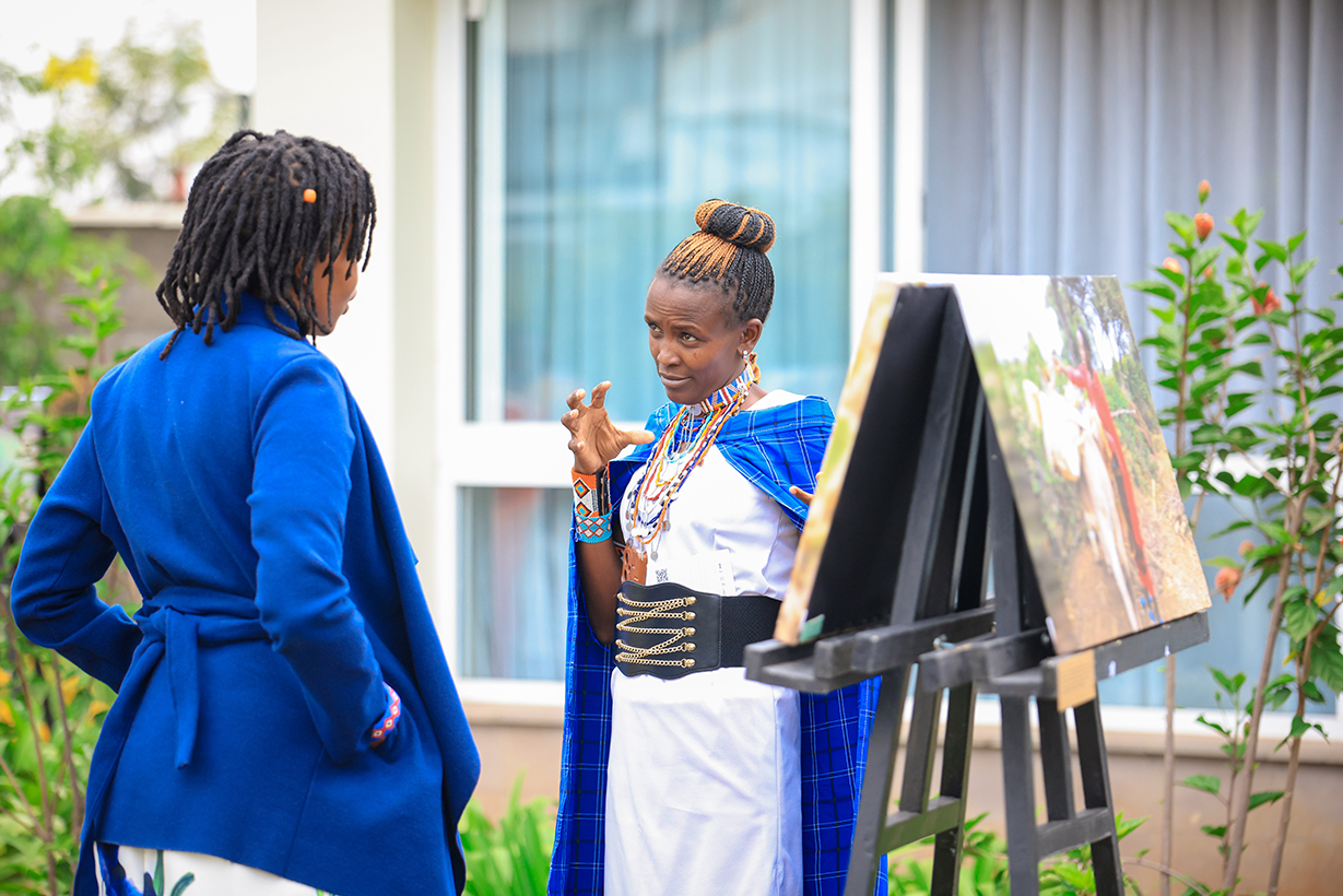 A trainee shares her visual story with a government representative on the lived realities of women in Kenya’s arid and semi-arid lands. (Credit: Leyian Mark Photography)