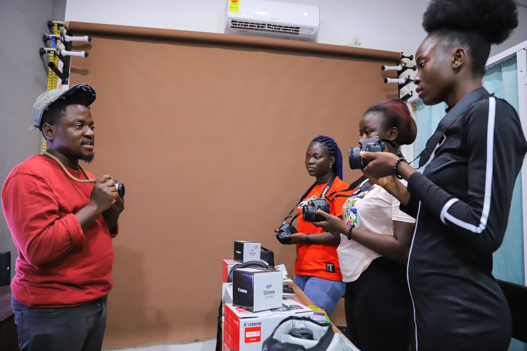 Refreshing on camera basics before diving into storytelling - photographer and Lensational Ghana programme facilitator Francis Kokoroko with participants at a workshop on photography and climate change adaptation in Tamale, Ghana (credit: Dennis Nipah)