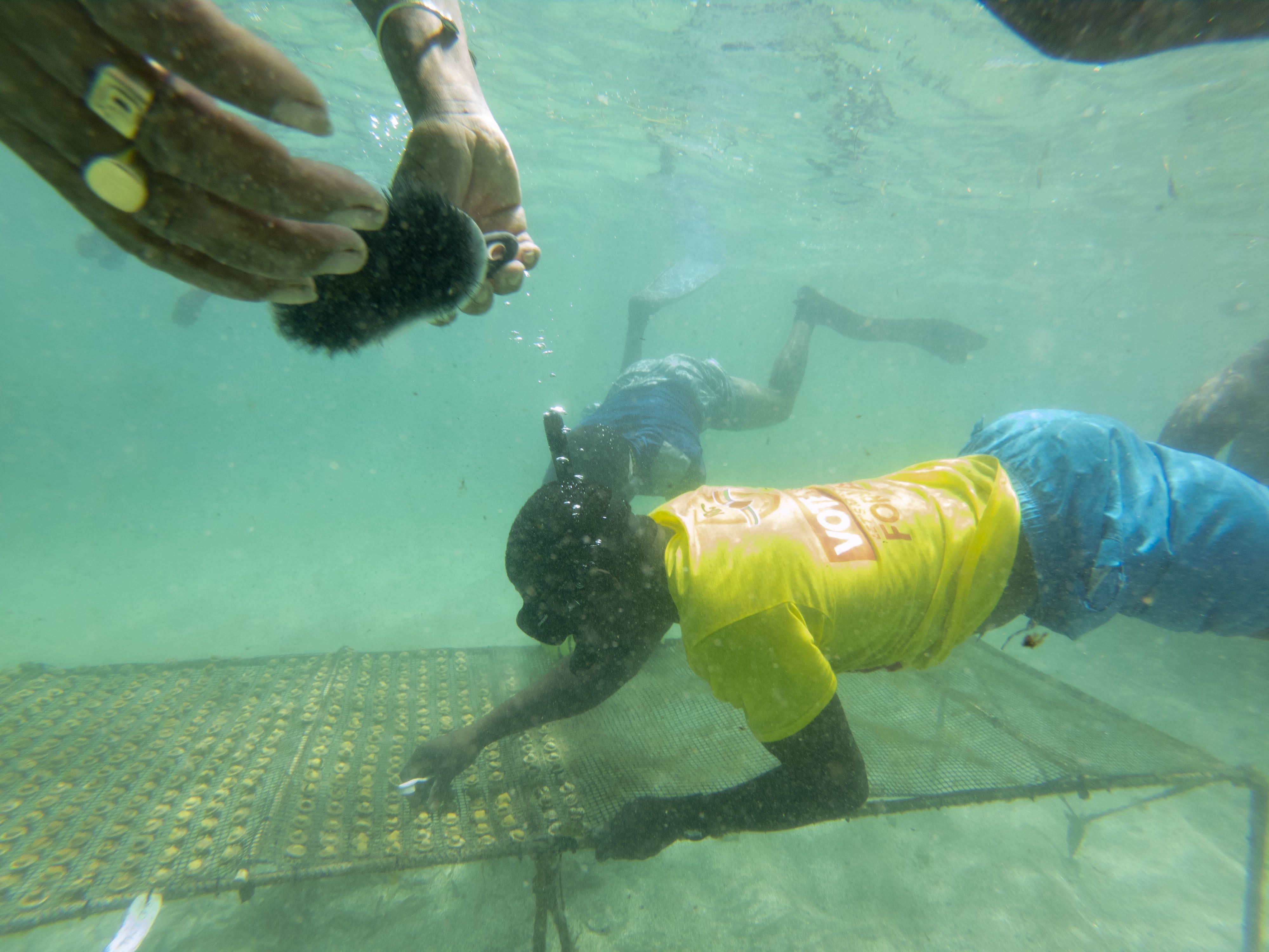 Coral gardeners, many of whom are local fishers, visit the local “in situ” coral nursery, twice a week to check on the growth of their harvested coral, regularly testing water quality and checking for bacteria. Diseased coral is quarantined and allowed to recover, while healthy corals are outplanted in the Telescope reef once they reach adequate size. The project team also aims to establish a full coral wet lab on land. Like the mangrove restoration in Carriacou, this work is an outstanding example of ecosystem-based adaptation approaches prioritized under the NAP.